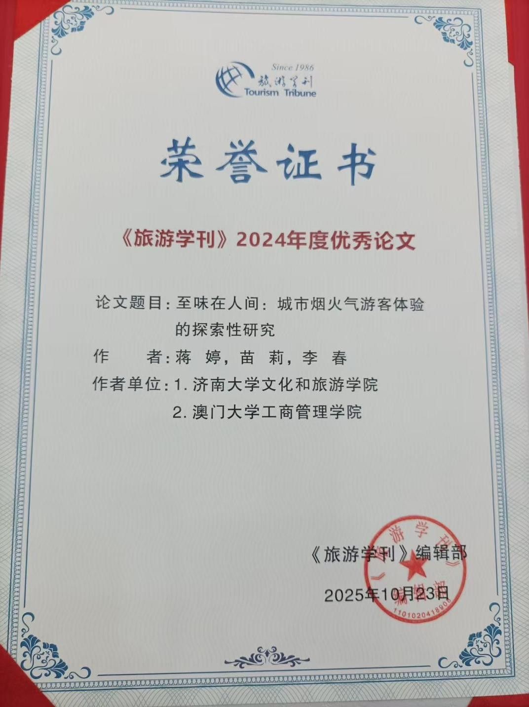 蒋婷教授和其研究团队撰写的论文《至味在人间:城市烟火气游客体验的探索性研究》,被评为2024《旅游学刊》年度优秀论文。