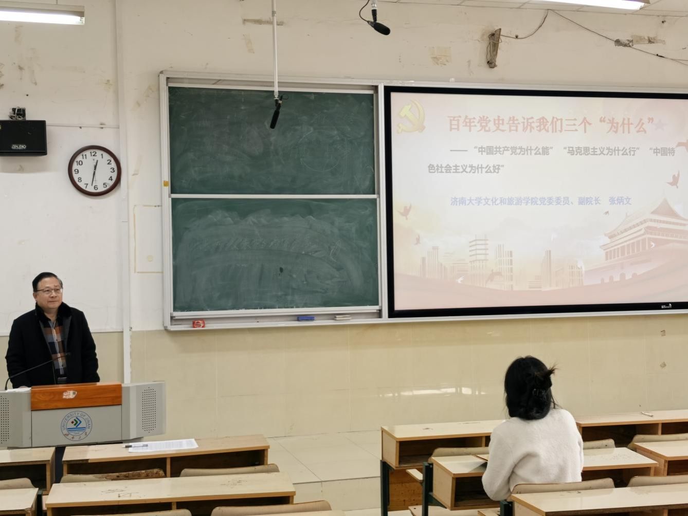学院副院长张炳文回顾了中国共产党建党百年的艰辛历程,以百年党史告诉我们3个“为什么”——“中国共产党为什么能” “马克思主义为什么行”“中国特色社会主义为什么好”为题进行党史学习教育。深刻阐释三个“为什么”的核心原因,解答三个“为什么”的实践路径,同时对新时代大学生提出要求。要用科学理论武装头脑,以习近平新时代中国特色社会主义思想为坚定理想信念;以学习为动能,持续增长本领;践行党员先锋模范作用,为改革发展贡献力量。