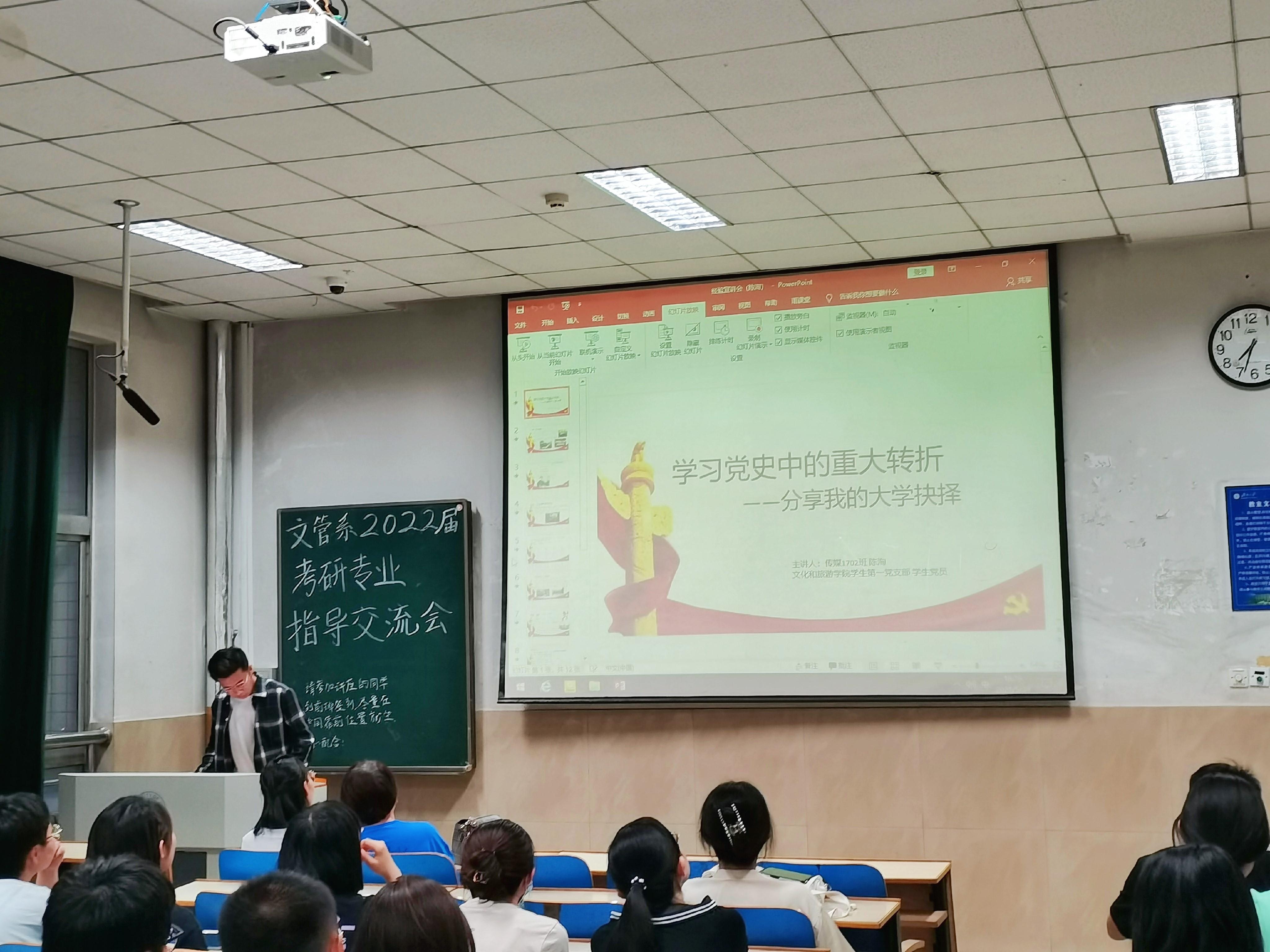 文管系党支部和学生第一党支部共同组织开展文管系考研专业指导及2021届毕业生党员考研经验分享交流会,为学院2022届考研学生提供指导和帮助,增强学生考研信心,提升考研竞争力。文管系专业教师顾方哲、宁秀丽现场答疑解惑,2021届文管系毕业生党员代表陈洵、王振华、赵倩倩、牛晨媛等四位同学分享备考经验,2022届文管系同学近百人参加活动。