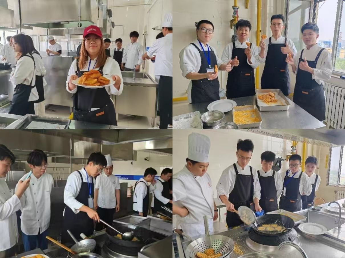 第三天,同学们赴烟台文化旅游职业学院。学院将胶东饮食文化深度挖掘,实训教室中的非遗文化展区,让同学们赞不绝口。在后续的学习中,中国烹饪大师、二级教授邓介强老师带来“海肠捞饭”“炸龙利鱼排”“油爆海螺”三款胶东名菜教学。“海肠捞饭”选用鲜活海肠,酱汁调配独家秘方;“炸龙利鱼排”对选材、腌制、裹粉和火候把控要求严格;“油爆海螺”选活螺,去腥增脆有妙招。同学们分组实操炸鱼排,从最初的手忙脚乱到在老师指导下炸出金黄酥脆的成品,收获满满成就感爆棚。