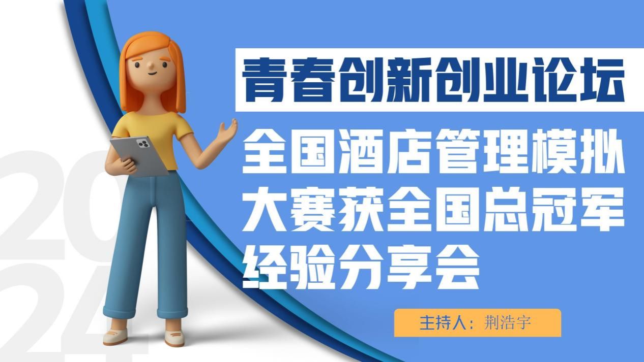 于2024年6月24日19:00-20:00在面向学生们开展了全国酒店管理模拟大赛获全国总冠军经验分享会。主讲人为荆浩宇同学,他通过讲解比赛流程、比赛规则和比赛评分使同学们对全国酒店管理模拟大赛有了进一步了解;并邀请获奖团队人员讲述自己的的备赛经验,分享如何准备比赛以及在比赛中遇到困难和挑战如何战胜,以及自己作品制作的思路、方法。