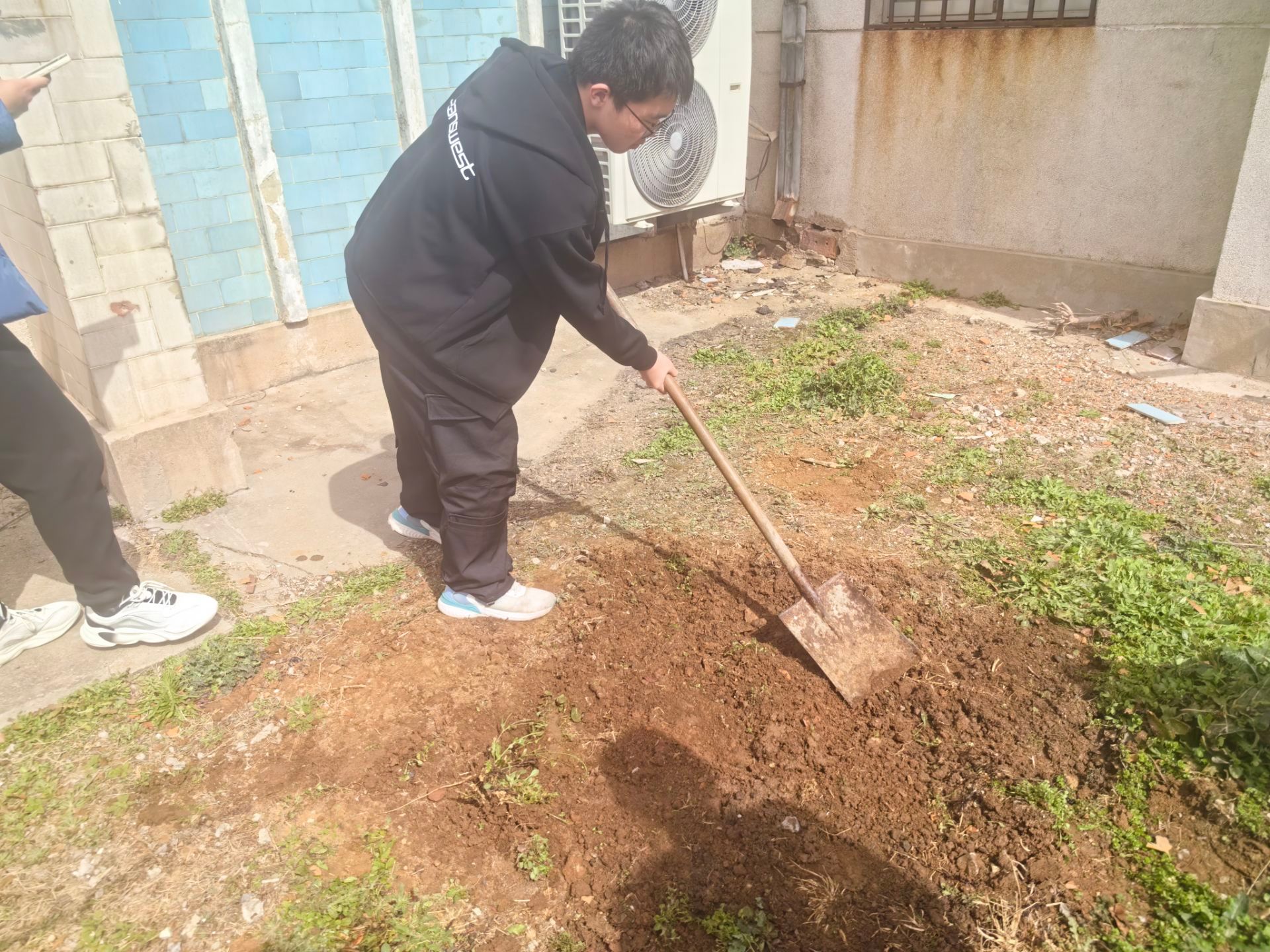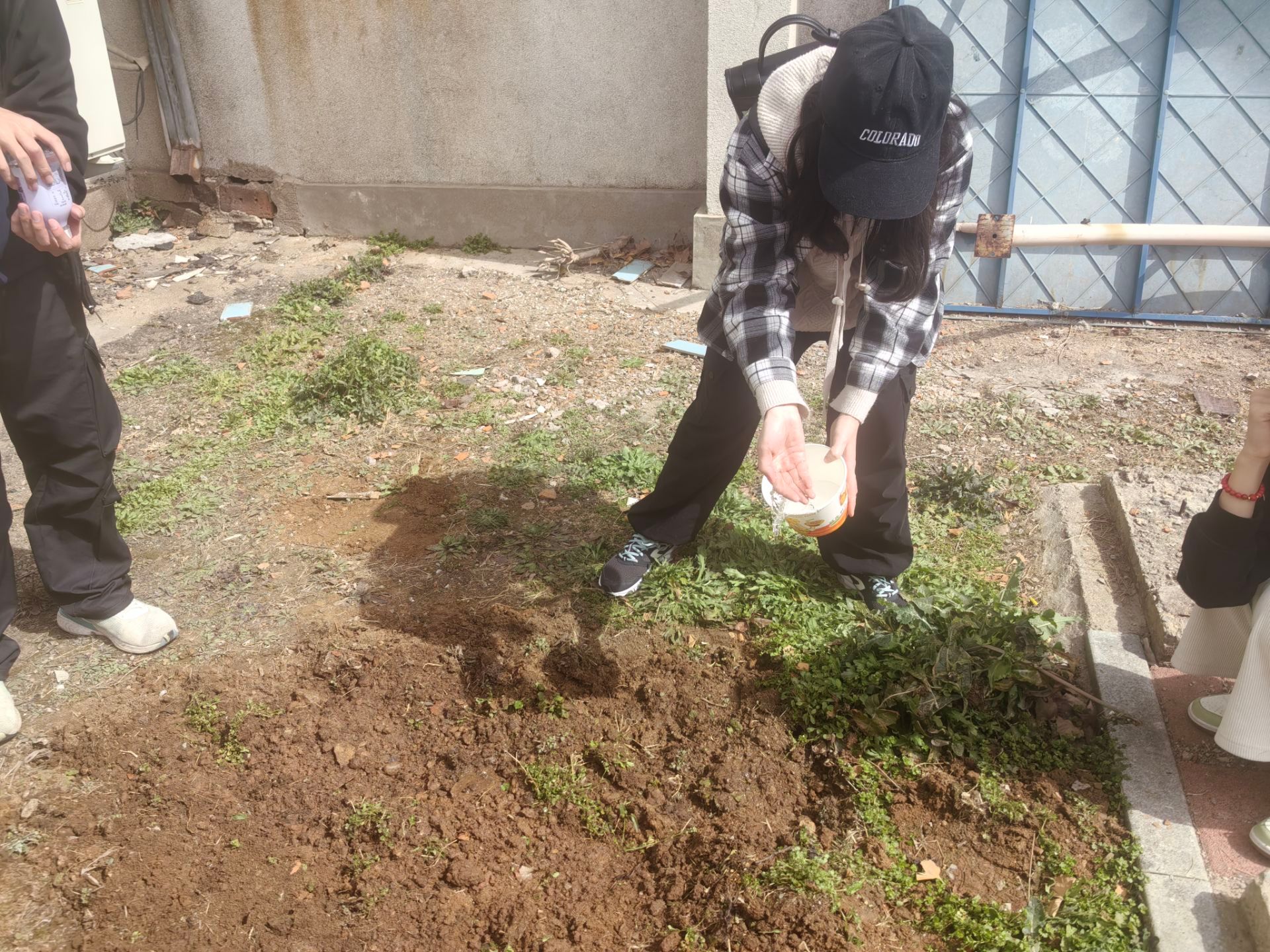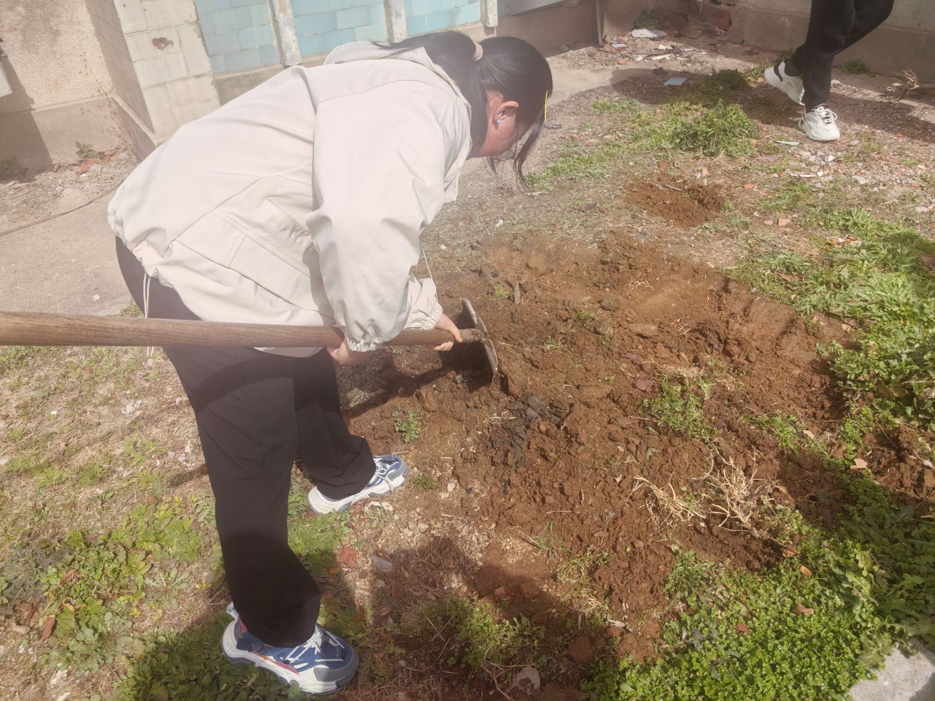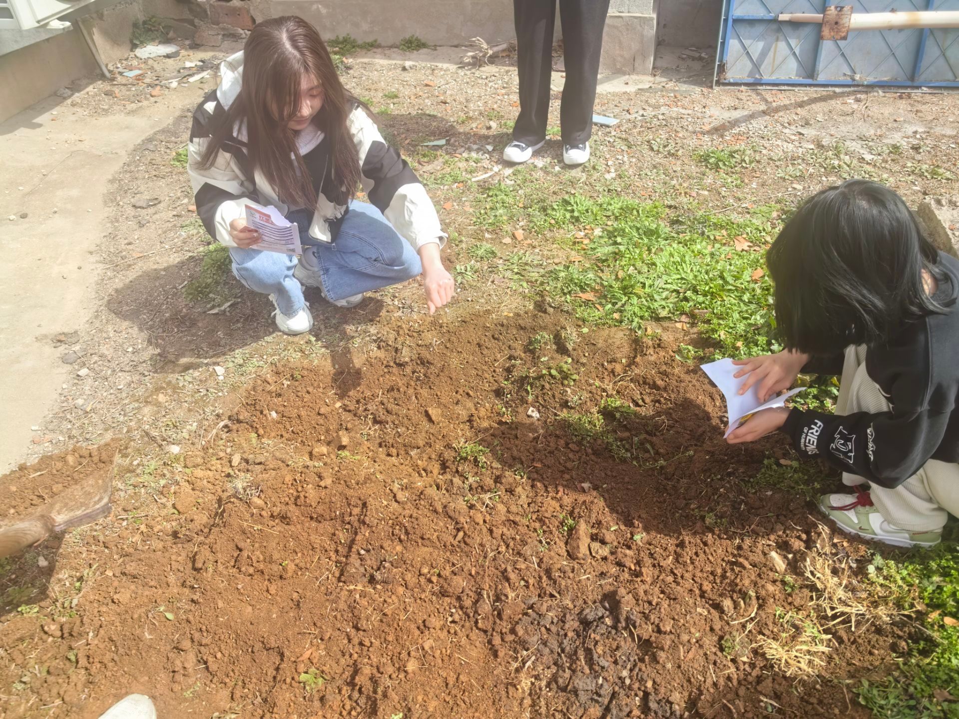 在师傅的指导下,大家分组行动起来,拿起铲子,开始松土、挖坑、播种。志愿者们小心翼翼地撒下生菜、圣女果种子,天井内充满了欢声笑语,大家一边劳动一边交流,气氛温馨而融洽。