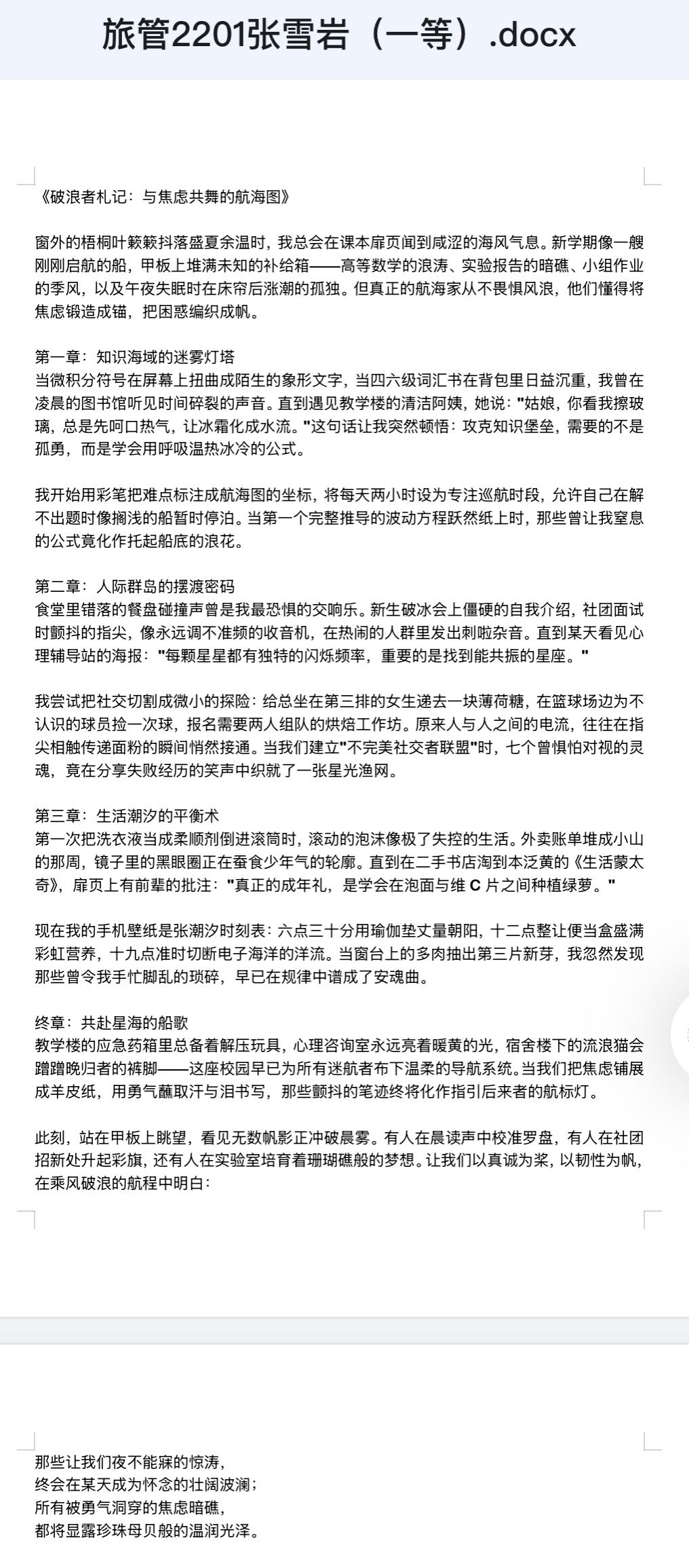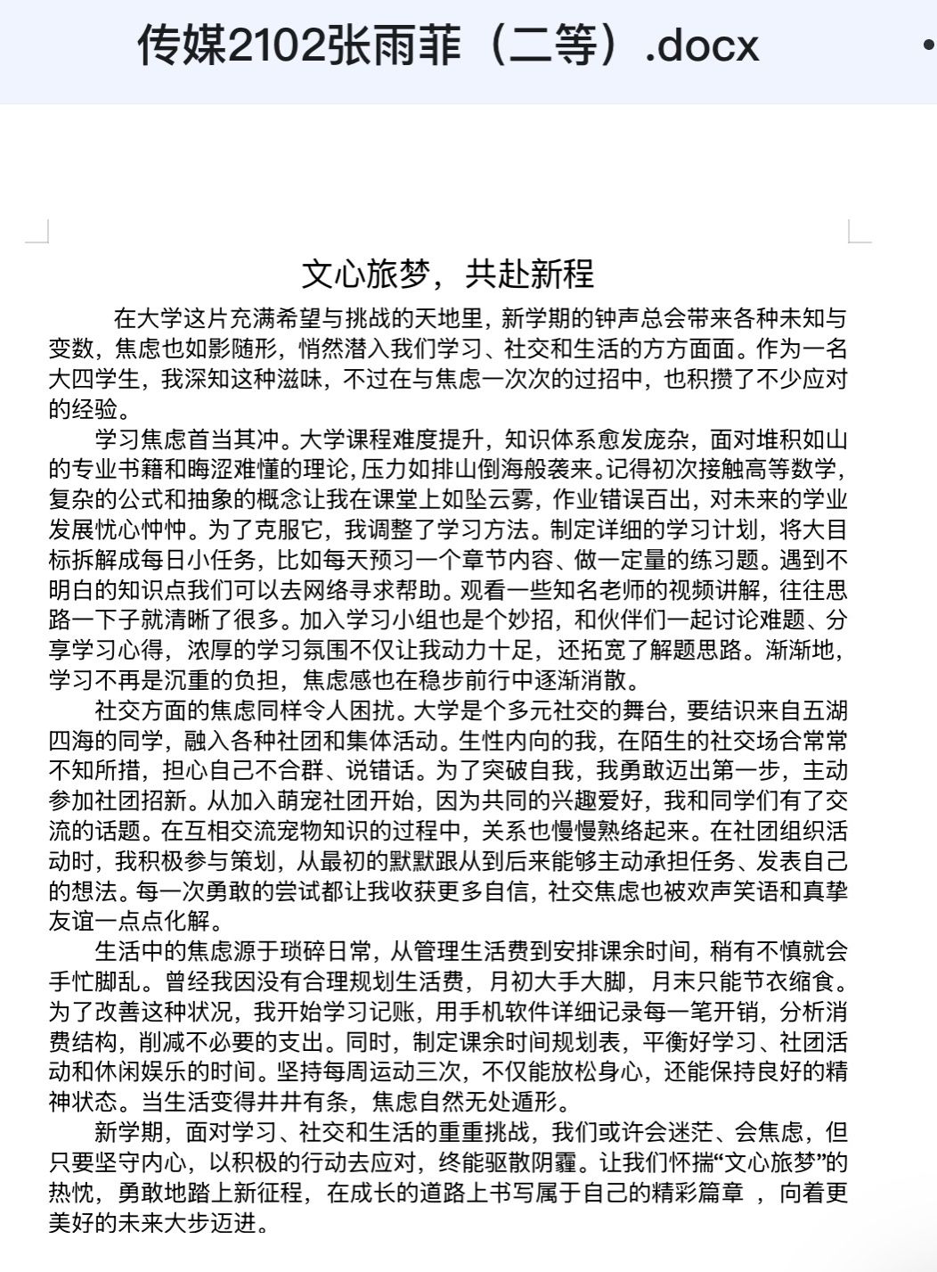 心理服务协会举办的 “文心旅梦,共赴新程” 征文活动顺利结束。此次活动旨在帮助同学们缓解新学期压力,激发学习动力,提升综合能力,增强信心与毅力,吸引了学院全体同学的积极参与。