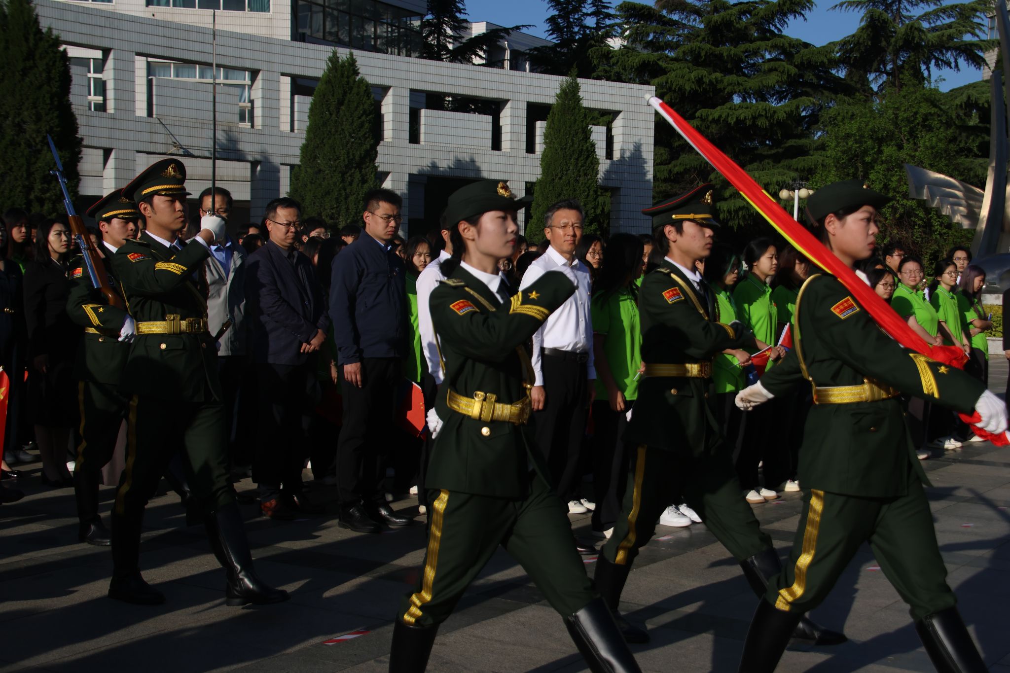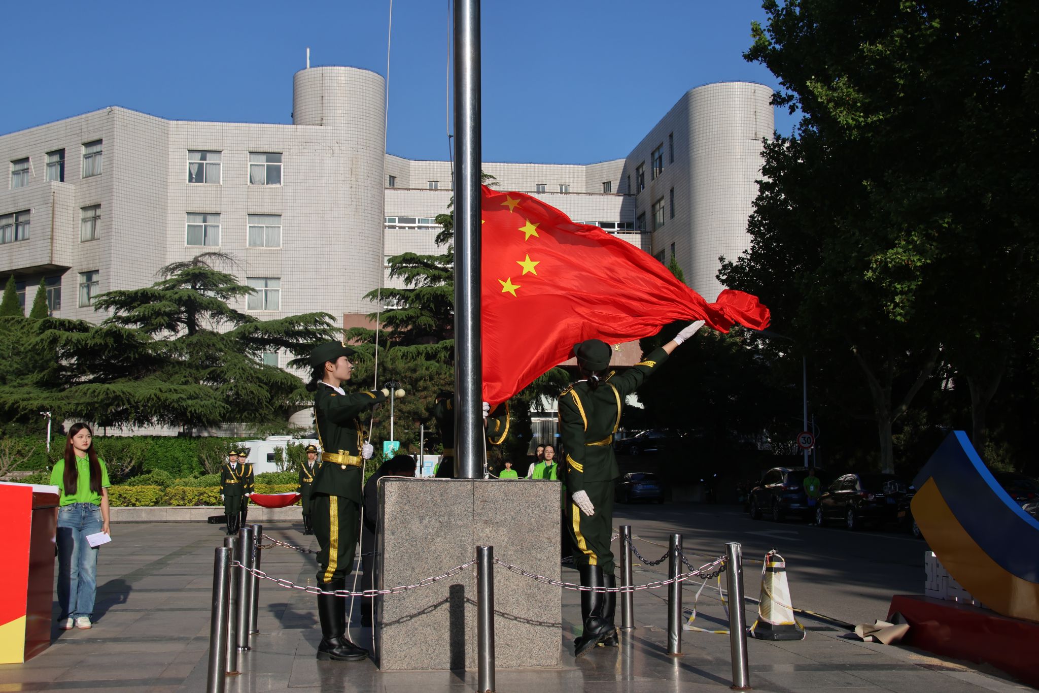 “齐步——走!”一声铿锵口令划破晨霭,国旗护卫队踏着整齐的步伐,护送五星红旗走向升旗台。全体师生肃立凝望,国歌奏响的瞬间,鲜红的旗帜迎着朝阳冉冉升起,与青年胸前的团徽、眼中的光芒交相辉映,红旗于蓝天中飞扬,这抹红是跨越百年的精神火炬!