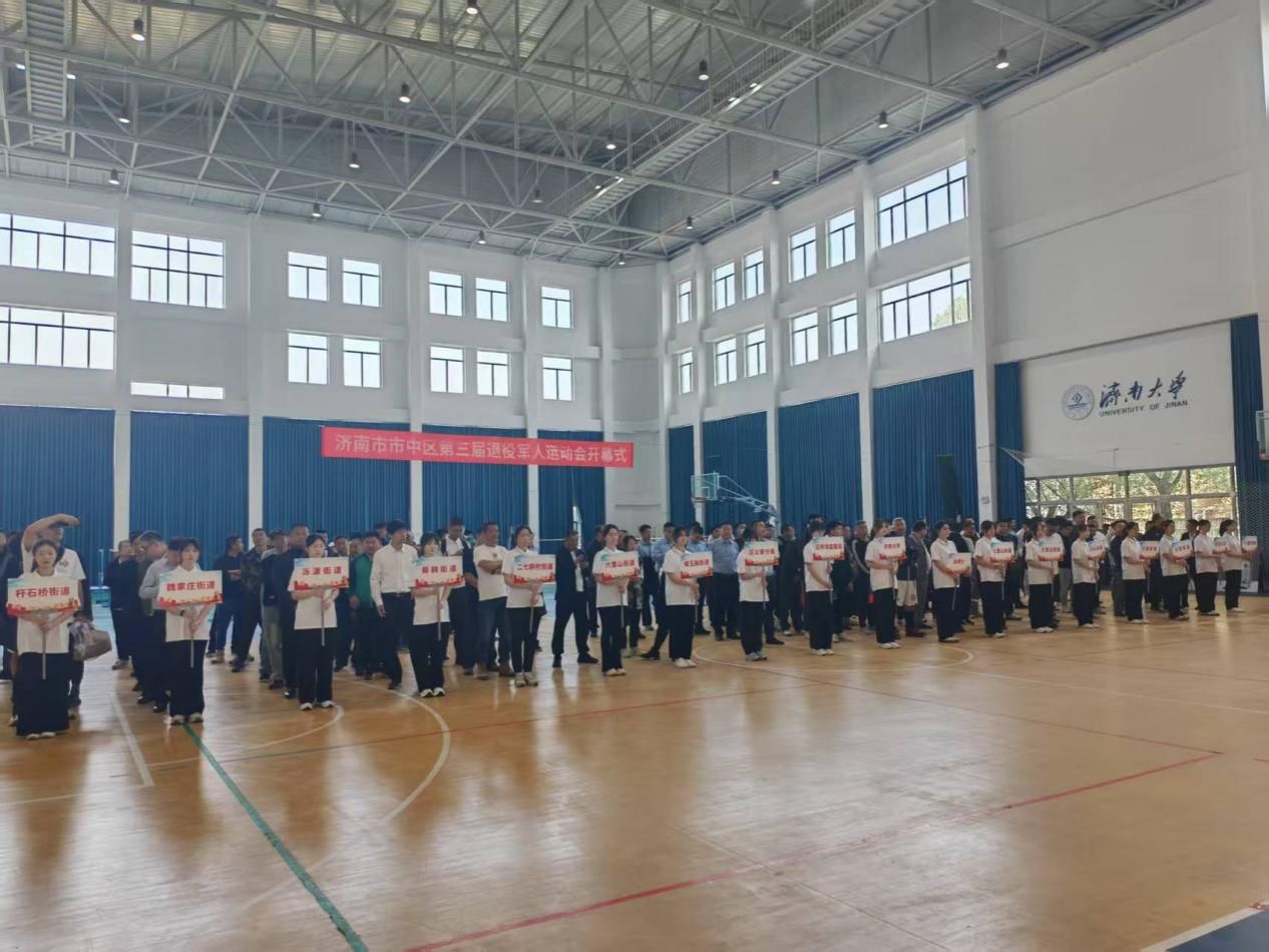 舜耕校区体育馆开幕,各街道均派出代表队参与本次开幕式。志愿者手持街道标识牌,引导各队列入场站位。在开幕式中,退役军人们观看了欧美性爱