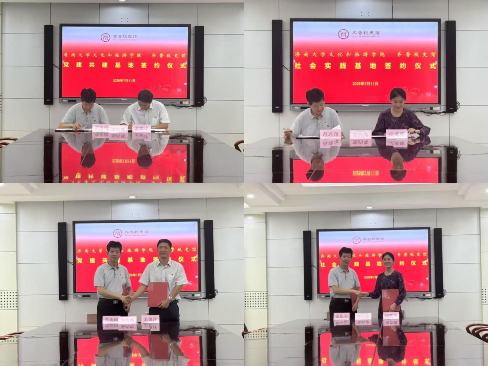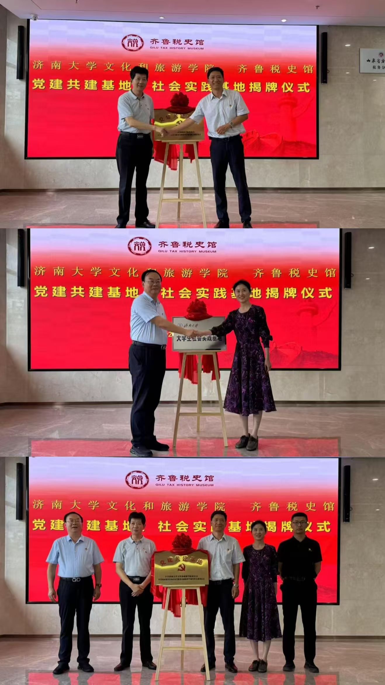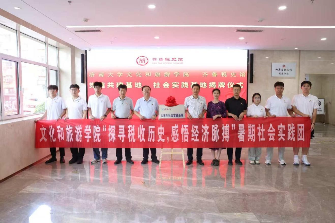 与齐鲁税史馆合作共建签约暨大学生社会实践基地揭牌仪式在齐鲁税史馆隆重举行。学院党委书记孟德洋,学院党委副书记、副院长信苏珊,学院团委书记吕龙飞以及齐鲁税史馆等相关领导出席活动。此次活动标志着双方在资源共享、协同育人、文化传承创新方面迈出了坚实一步,为文旅学子深入了解国情社情、厚植家国情怀、提升实践能力搭建了重要平台。