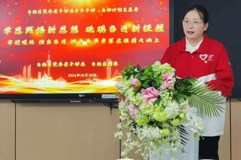 2024届优秀毕业生、西部计划优秀志愿者牛家华同学担任主讲人。这位从沂蒙山走出的姑娘,怀揣感恩与奉献之心,毕业时毅然加入西部计划,跨越3500公里,从齐鲁大地奔赴天山脚下。服务期间,她扎根基层一线,亲历基层发展变迁,发挥专业特长担任“建功西部—新疆青年推介官”,用声音讲述新疆故事,用镜头记录边疆风光。西部计划服务期满后,她顺利考入军队文职岗位,以志愿经历为人生赋能,用亲身经历诠释了当代青年的责任与担当。