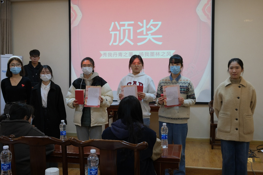 吴鲁锋老师和杨萍老师对此次活动进行了总结讲评。吴鲁锋老师从六艺讲起,提出应该重视书法书写。杨萍老师则赞扬了此次活动的比赛形式,鼓励大家潜心研究书写、重视书写。最后,评委为选手颁奖,选手们与评委进行合影留念。