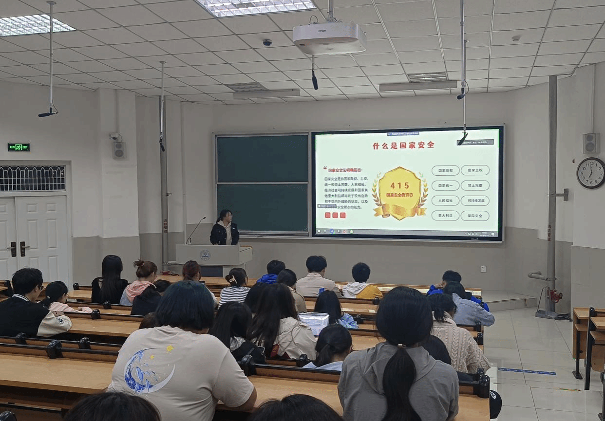 主讲人辛欣同学以国家安全日的设立为开篇,为同学们剖析了国家安全的深刻内涵,鼓励同学们积极践行总体国家安全观,让安全意识成为生活的一部分。观看完国家安全知识讲解教育短片后,辛欣根据视频中所讲解的相关国家安全知识,提醒同学们在日常生活中应时刻警惕危害国家安全的行为。在互动环节,辛欣同学以知识问答和发放宣传图册的方式,结合具体案例,帮助同学们了解相关国家安全的法律法规。最后她表达了同学们在维护国家安全中积极行动,不做局外人、旁观者,做到人人有责并切实尽责的希望。