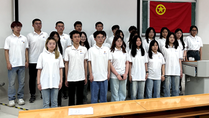 2024年度新发展团员名单,并由所属班级团支部委员为新发展团员佩戴团员徽章,颁发团员证。在学生会工作人员孙玉同学带领下,新老团员在团旗下庄严宣誓,表达他们加入共产主义青年团的决心和信念。