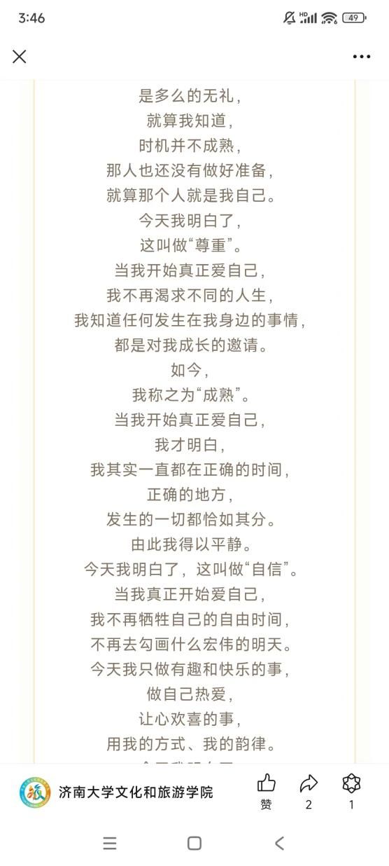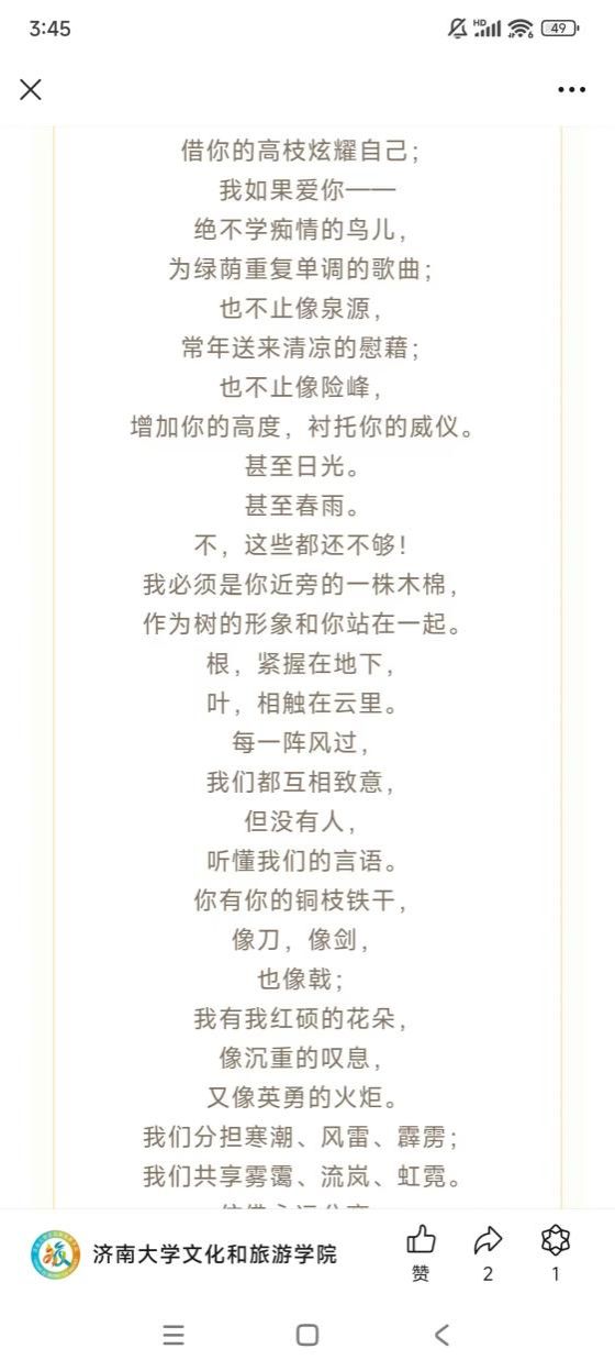 通过“向着阳光,以诗宴春”心理美文诗歌朗诵活动,让学生感其声,领其情,抒其志,营造了浓厚诵读抒情解郁氛围,增强了大学生的责任感和使命感,提醒大学生珍惜青年时光养成健康良好的人生观、价值观、世界观。活动共收到来自学生的30余份参赛作品,通过公众号推送形式,传递春天的温暖和力量,让每一位朗读者和聆听者都能感受到生活中的美好和希望。