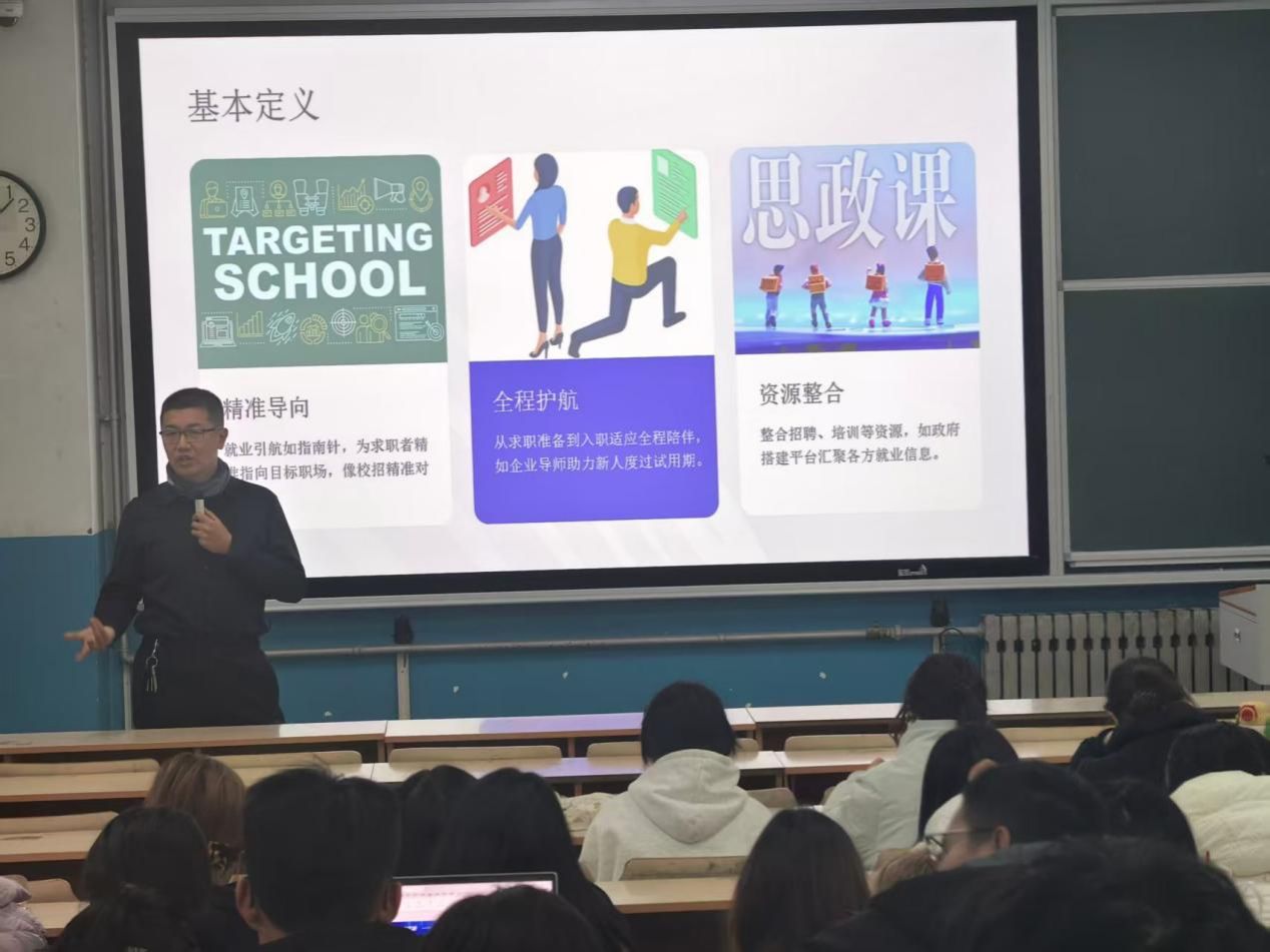 宣讲会首先介绍了“就业引航”的基本概念。它如同职场中的“指南针”,为学生提供精准的就业导向;同时贯穿求职全程,从准备阶段到入职适应,实现“全程护航”;并通过整合校内外招聘、培训等资源,搭建起高效的就业信息平台。